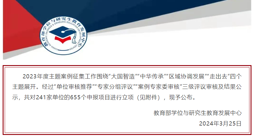 本次主题案例征集工作由教育部学位与研究生教育发展中心(简称“学位中心”)发起,围绕“大国智造”“中华传承”“区域协调发展”“走出去”四个主题展开,共311家研究生培养单位推荐申报1483个项目,涵盖62个专业学位类别。经过“单位审核推荐”“专家分组评议”“案例专家委审核”三级评议审核,对241家单位的655个申报项目进行立项。