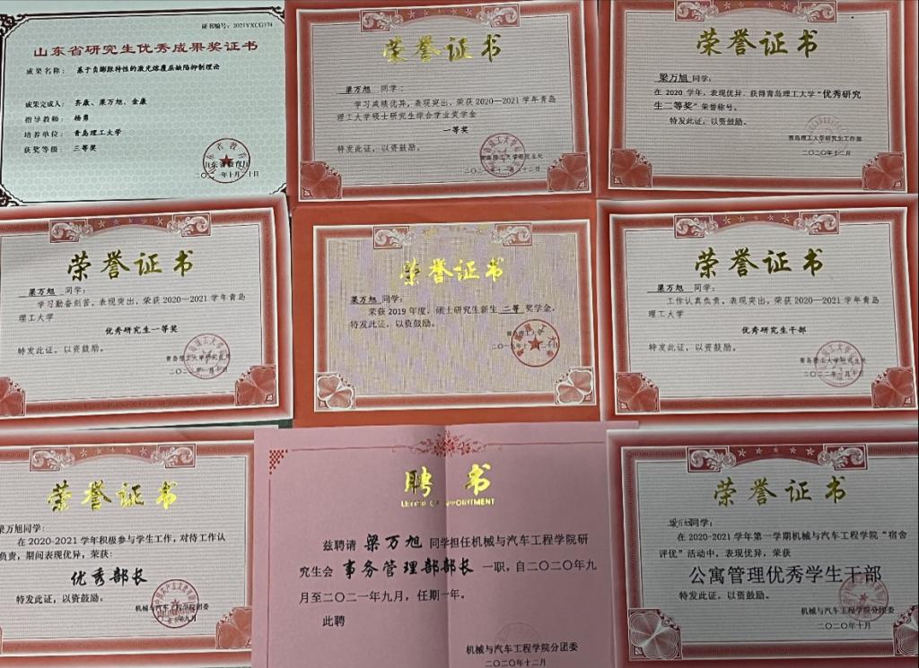 工作方面,担任机械与汽车工程学院研究生会事务管理部部长、机车研191班班长职务。负责学院宿舍卫生及用电安全监督,上传下达学院各项通知,积极带领班级营造良好的科研氛围。所在班级被评为“优秀团支部”及“优秀研究生班集体”。个人曾获yl34511线路中心优秀研究生干部、优秀共青团员等称号。