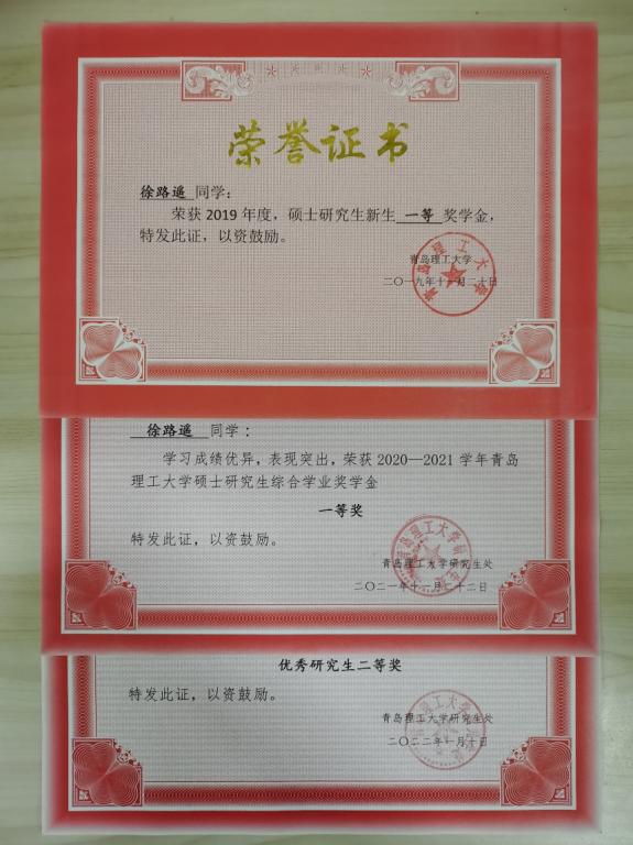 硕士三年期间,荣获研究生新生一等奖学金、研究生综合学业一等奖学金和优秀研究生二等奖。英语顺利通过六级,熟练掌握本专业英语专业词汇,具有良好的书面表达能力。身为学生党员,热爱班集体,关心同学,善于组织协调和协同各方资源,于2021年被评为全国校园足球联赛优秀志愿者。